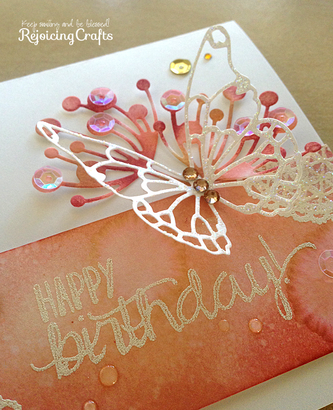 I made birthday card for one of my lovely friend Joanne. She is very calm and elegance. So, I choose soft pink colour background and one of my favourite Memory Box Vivienne Butterfly Die for her. Did I make a good choice? Please say “YES!!”