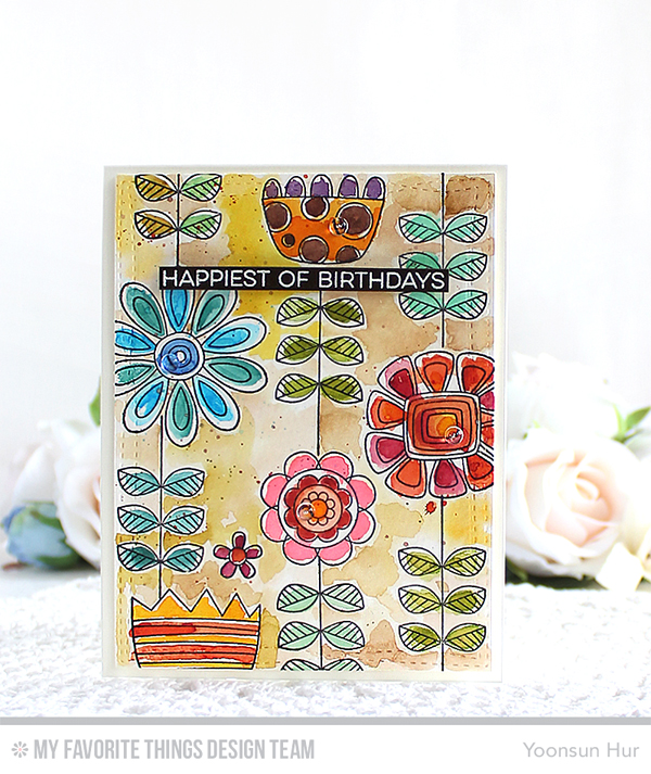 I started by stamping whimsical flowers and leaves from the Doodled Blooms set on watercolour paper in Black Licorice hybrid ink, then trimmed it out using the Wonky Stitched Rectangle STAX Die-namics. Next, I coloured them with Peerless watercolors, added some ink splatters all over the panel. For the sentiment, I heat embossed it from the More Essential Sentiments set onto black cardstock in white. Once the watercoloured panel was dry, I mounted it on top-folded white card base using foam tape, and then added the sentiment banner and some clear droplets.