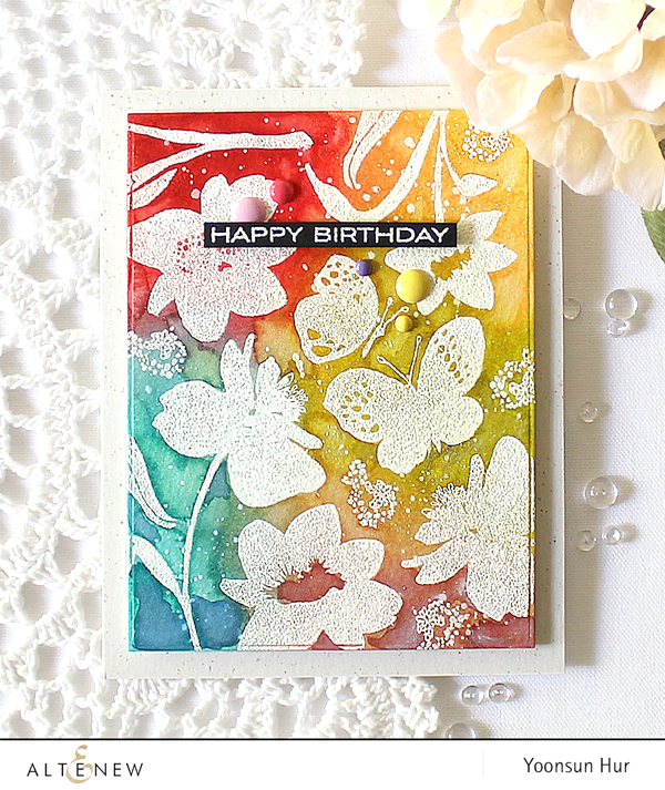 I made a happy birthday card for the Altenew!! I love making white heat embossed images + Distress ink blended background with the Altenew flower stamp set! I randomly heat embossed flowers and leaves from the Floral Garden set in the New Day card kit on watercolour panel in white, and then ink blended on it with some Distress inks in rainbow order: Festive Berries, Scattered Straw, Crushed Olive, Peacock Feathers and Victorian Velvet. I then lightly brushed on the ink blended panel using a wet paint brush. Once the panel was dry, I mounted it on Spicy Yogurt card base using foam tape first, and then added the sentiment banner using foam tape as well.