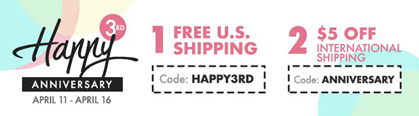 FREE U.S. shipping with code HAPPY3RD or $5 OFF international shipping with code ANNIVERSARY at checkout. Offer valid from April 11th through April 16th at 11:59 pm EDT. Not valid on prior purchases. Cannot be combined with other promo codes.