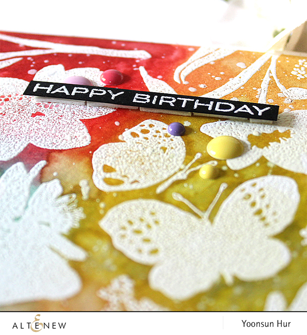 I made a happy birthday card for the Altenew!! I love making white heat embossed images + Distress ink blended background with the Altenew flower stamp set! I randomly heat embossed flowers and leaves from the Floral Garden set in the New Day card kit on watercolour panel in white, and then ink blended on it with some Distress inks in rainbow order: Festive Berries, Scattered Straw, Crushed Olive, Peacock Feathers and Victorian Velvet. I then lightly brushed on the ink blended panel using a wet paint brush. Once the panel was dry, I mounted it on Spicy Yogurt card base using foam tape first, and then added the sentiment banner using foam tape as well.