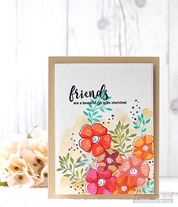To start, I die cut a piece of watercolour paper using 3.75″ x 5″ rectangle panel die in the Basic Rectangles die set. I then stamped flowers and leaves from the Friends Of Life set on the bottom right corner of the panel using SSS hybrid inks (Supply links are at the bottom of the post). I lightly coloured around stamped images with Antique Linen Distress ink, and then stamped the sentiment from the Friends Of Life set on the panel in VersaFine Onyx Black pigment ink. Once the panel was dry, I mounted it on top-folded kraft card base using foam tape.