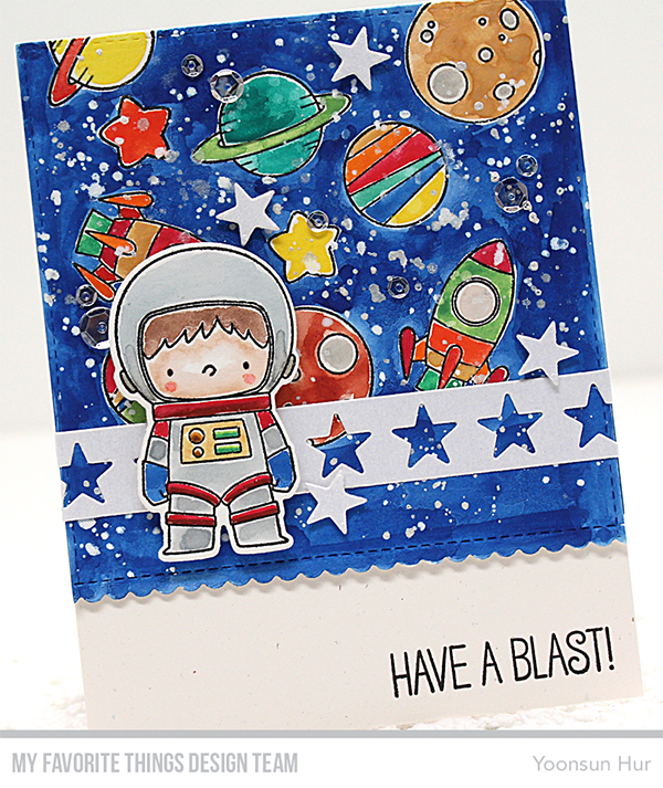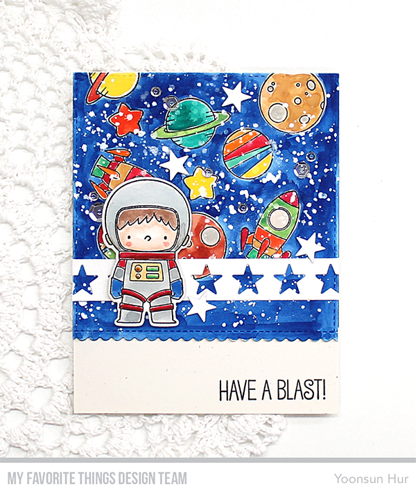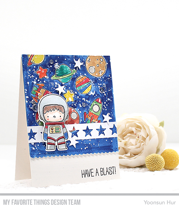 I started by stamping space scene from the Space Explorer set on watercolour panel using black pigment ink, and then trimmed the bottom of the stamped panel down using the Stitched Scallop Basic Edges 2 Die-namics. I then watercoloured them, added opaque white & pearl silver ink splatters all around the panel. I stamped and watercoloured an adorable space explorer on a separate watercolour paper, and then die cut it with the Space Explorer Die-namics. I die cut the Star Stripe from white card stock. Before I mount all elements, I stamped the sentiment on the bottom right corner of Primitive White card base in Black Licorice hybrid ink.