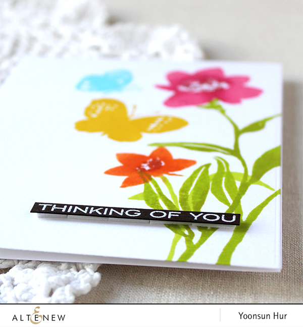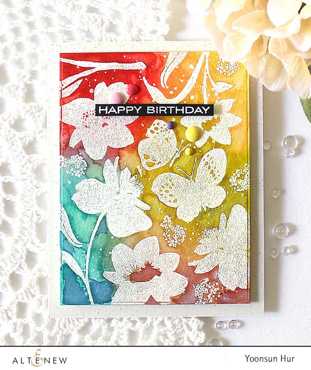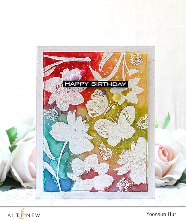 For my last card today, (I think some of you might already see this card on the Altenew blog before) I white heat embossed images from the Floral Garden set on watercolour paper panel and then ink blended on the panel with some Distress inks.