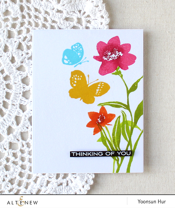 For my second card, I used the Floral Garden stamp set in the card kit. I stamped flowers and butterflies from the Floral Garden set on white panel using several dye inks: