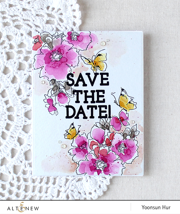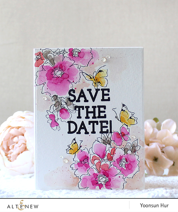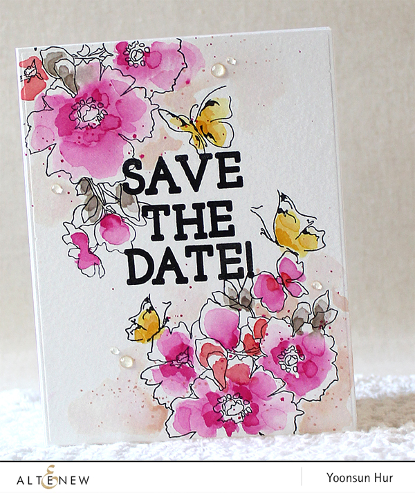 I stamped my own sentiment “Save the date!” from the Thick and Thin Alpha set on the centre of watercolour panel in black pigment ink, and then outlined flowers (from the Charmed set) and butterflies (from the Painted Butterflies set) around the sentiment area in black ink as well. I loosely coloured the stamped images with Distress inks and a wet paint brush. Once the panel was dry, I mounted it on white card base using glue tape first, and then added water droplets using Glossy Accents.