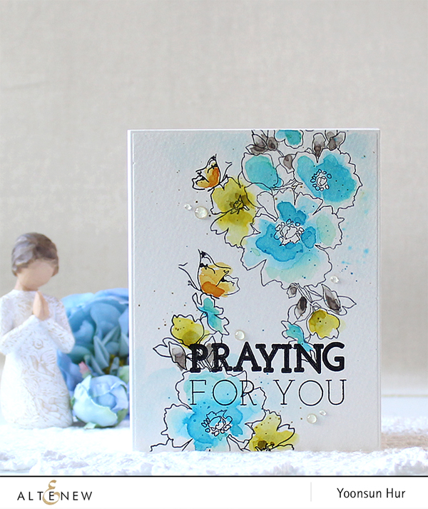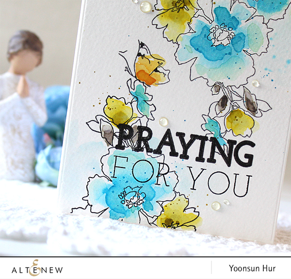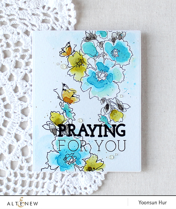 In my second card, I stamped the word “Praying for you” from the Thick and Thin Alpha set on watercolour panel in black pigment ink, and then outlined flowers (from the Charmed set) and butterflies (from the Painted Butterflies set) around the sentiment area in black ink as well. I chose blue, green, and yellow Distress inks for watercolouring.