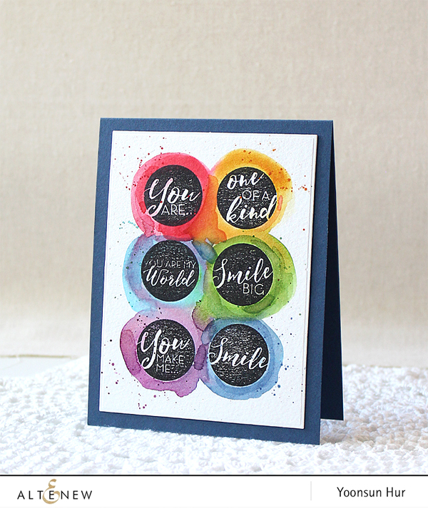 For my third card, I used the Circled Sentiments stamp set. I stamped 6 circled sentiments on watercolour panel in black pigment ink, and then roughly coloured around the stamped images with Distress inks in rainbow order. I added some ink splatters, then mounted the panel on navy card base using foam tape.