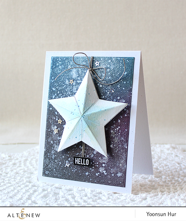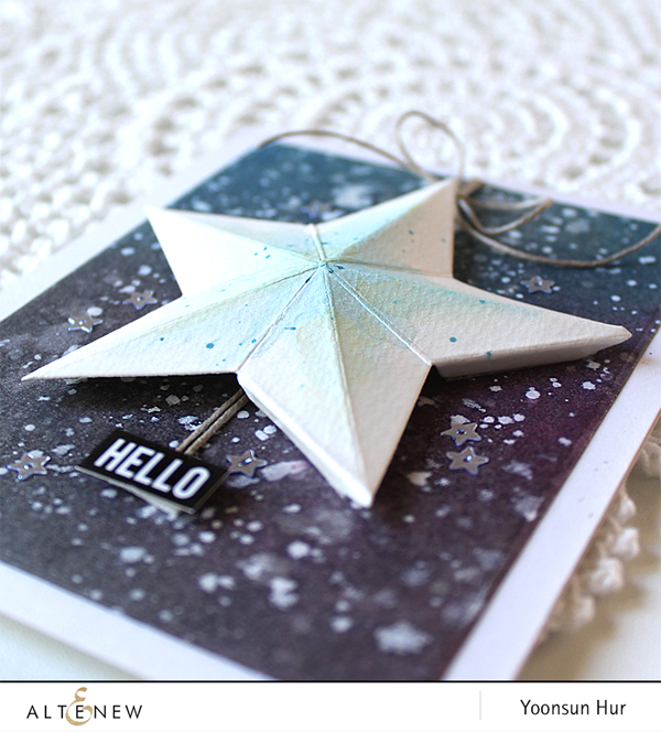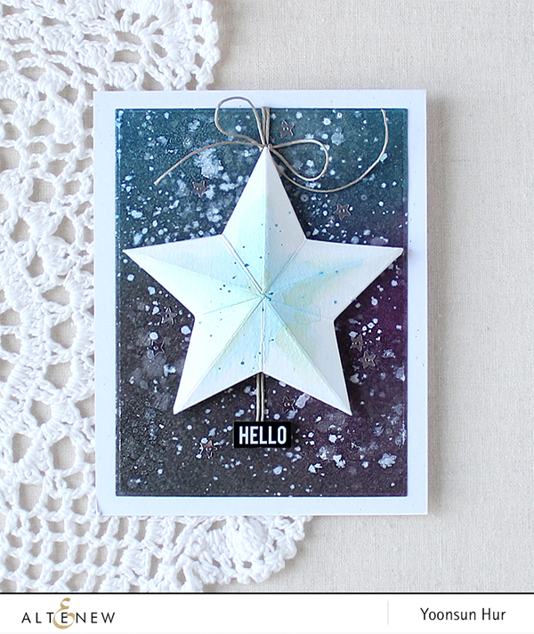 For my last card, I used the 3D Star die! I created a galaxy background using Distress inks first. I ink blended the panel with Faded Jeans, Seedless Preserves, and Black Soot Distress inks, then added metallic silver & opaque white ink splatters on the blended panel. I then die cut the 3D Star from watercolour paper, lightly coloured on it with Mermaid Lagoon Distress ink and a wet paint brush. Once the background panel was completely dry, I mounted it on white card base using glue tape first, and then added all elements as shown to the card front using foam tape.