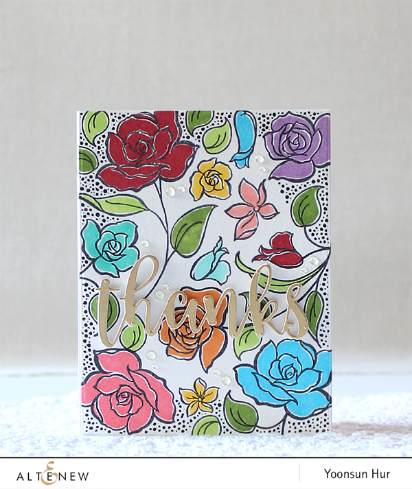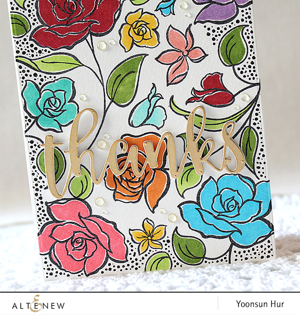 I started by stamping flowers and leaves from the Altenew Amazing You set on white paper panel in black dye ink. I then coloured the stamped images with the Altenew Artist Markers & Copic markers. I added tiny black dots between images using Copic multiliner. For the sentiment, I die cut the word “Thanks” from metallic gold card stock using the Altenew Script Words 2 dies five times, glued them together using fine tip glue pen. I mounted the floral panel on white card base using Altenew glue tape first, and then added the sentiment die cut on the card front using foam tape. I added water droplets using Glossy Accents.