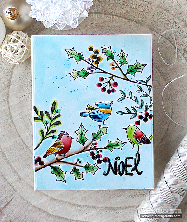 I started by stamping cute birds and branches from the Winter Aviary set on an A2 sized watercolour panel in VersaFine Onyx Black. I then watercoloured the scene with Distress markers and water brush. I coloured the background with Tumbled Glass Distress ink. Once the panel was dry, I stamped the sentiment on the bottom right corner of the panel in black pigment ink (It is coated with Glossy Accents).