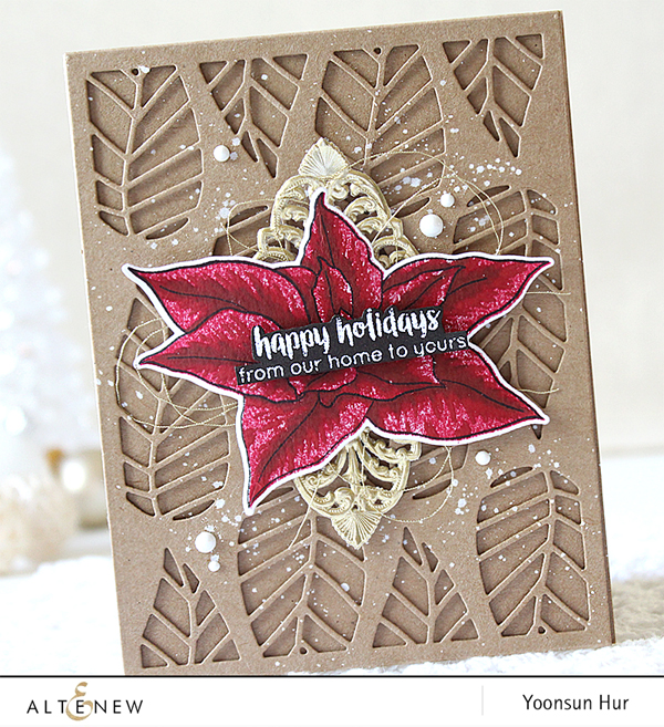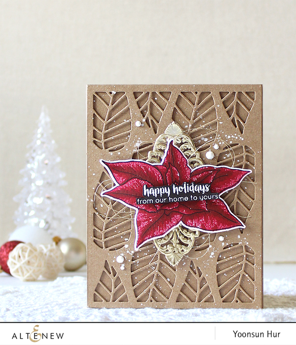 For the background, I die cut the Striped Leaf Cover from kraft card stock, and then mounted the “Striped Leaf” panel on kraft card base using foam tape. I added white ink splatters here and there. I added Gold Fenstone Decorative, poinsettia die cut, and sentiment banner in order using foam tape as well. To finish it off, I added white dots using Nuvo Simply White Crystal Drops.