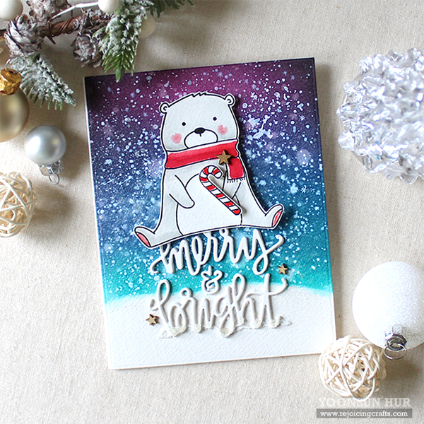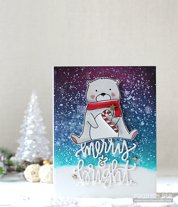 Once the panel was completely dry, I mounted it on white card base using double-sided tape first, and then added the sentiment die cut and the polar bear holding a candy cane on the card front using foam tape.