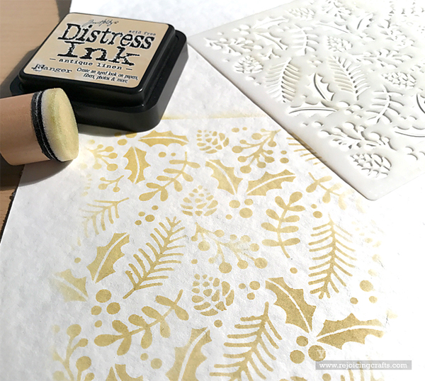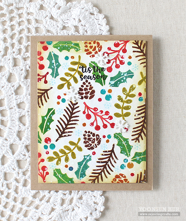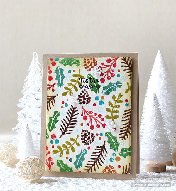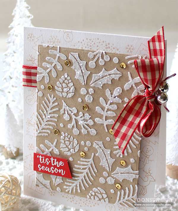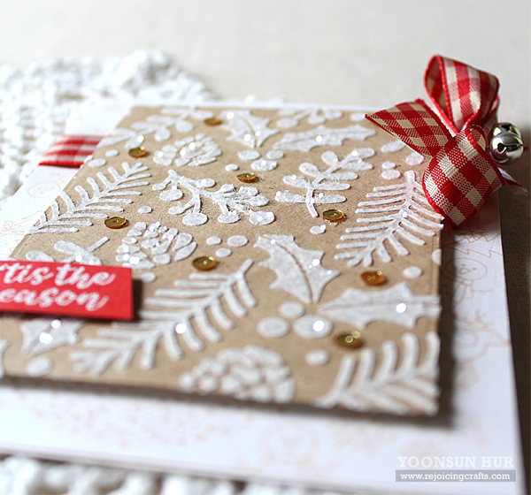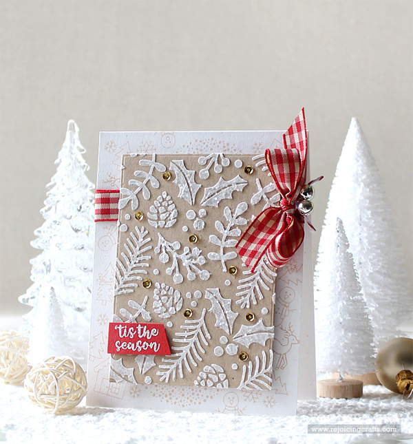 To create the card, I cut kraft card stock to 3″ x 4.5″ using rectangle panel die. I then placed the Holiday Foliage stencil over the kraft panel, and then applied the white embossing paste using palette knife. I added the clear glitter to the embossing paste while they’re still wet.