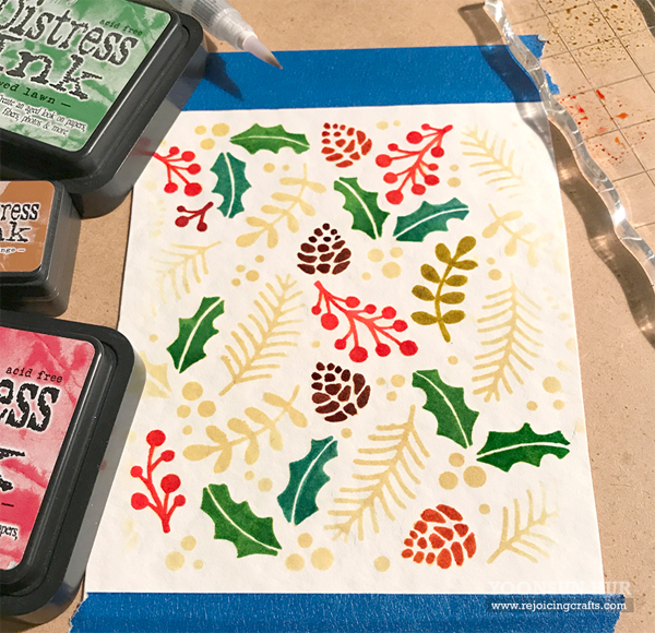 I then coloured each inked image with several Distress inks and water brush: Festive Berries, Mowed Lawn, Evergreen Bough, Rusty Hinge, Crushed Olive, Vintage Photo.