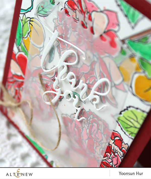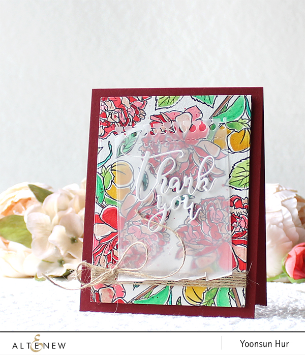 I die cut “Thank you” sentiment from white card stock using the Flower Arrangement die set. It’s a beautiful and trendy script font!