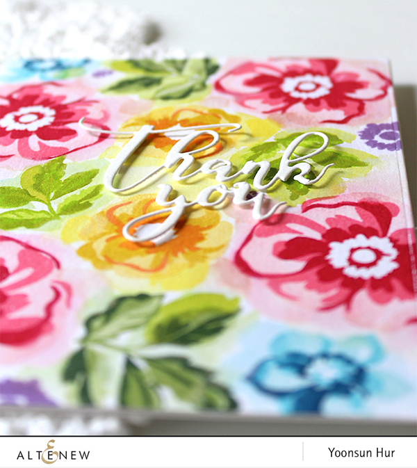 For my first card, I used the Happy Together stamp set and “Thank you” word die in the Flower Arrangement die set. I started by stamping flowers from the Happy Together set randomly onto watercolour paper panel in pigment black ink, and then watercoloured the panel with several Distress inks.