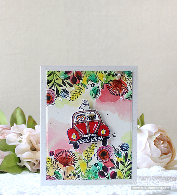 I started by stamping “driving friends” from brand new Love Bug set on watercolour paper, watercoloured it with Hero Arts Watercolor Wheel, and then fussy cut it out. For making floral background, I stamped cute flowers & leaves from two Winter Aviary & You Me and Tea sets on the top & bottom of watercolour paper panel using VersaFine Onyx Black pigment ink, loosely watercoloured them with Hero Arts Watercolor Wheel as well. I added more watercolours using Festive Berries Distress ink.
