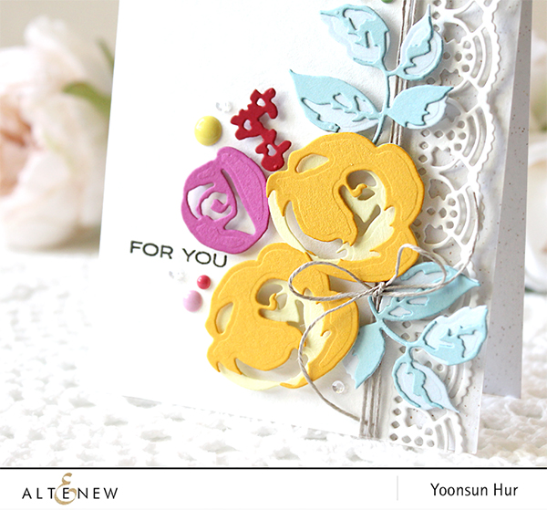 I die cut A2 sized rectangle panel from white card stock, then die cut from the right side of the panel using brand new Creative Edges: Lace die. For the flowers, I die cut them from coloured card stocks using the Rose Flurries 3D die set, then made a bunch of flowers.