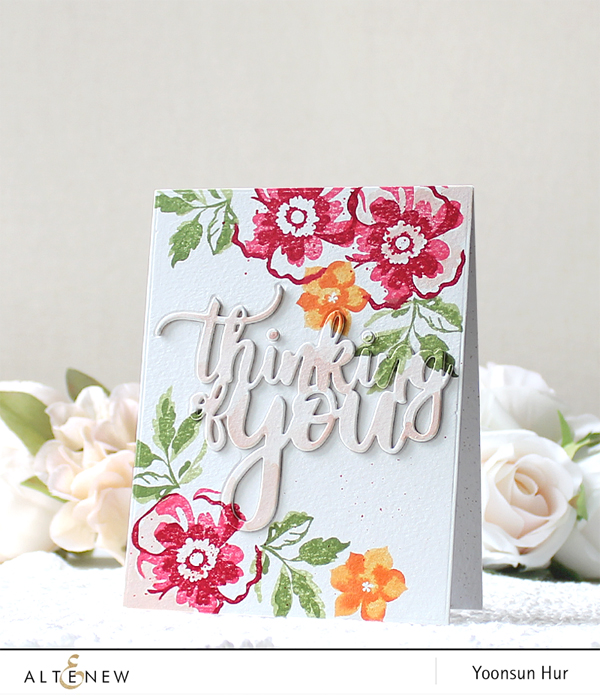 The new sentiment “Thinking of You” die is so gorgeous!! First, I made a floral background using the Flower Arrangement stamp set. Next I die cut the “Thinking of You” from the centre of the stamped panel. I stacked 4 other die cuts under the stamped sentiment cut using fine tip glue pen. After mounting, I lightly coloured the sentiment with Tattered Rose Distress ink and water brush.