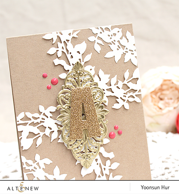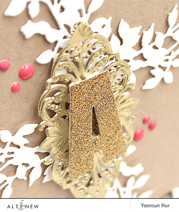 I adhered the white leafy garland die cuts on kraft card base using Altenew glue tape & foam tape. I then added the Altenew Fenstone Decorative Element and the letter “A”, as shown in the picture, using foam tape. To add a bit more colour, I decorated the card with hot pink enamel dots. Easy peasy, right?!