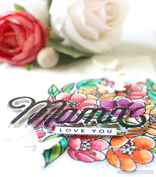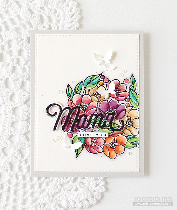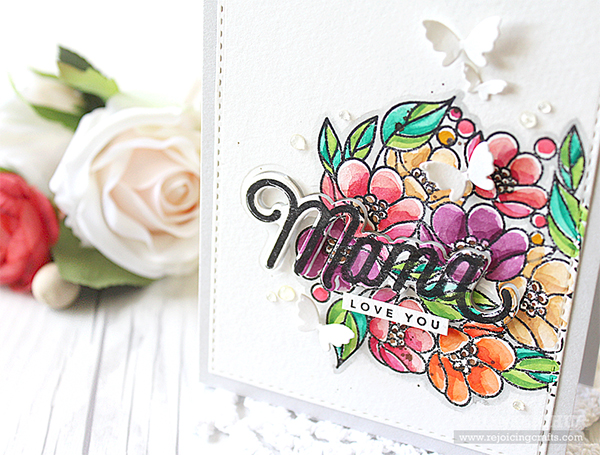 I mounted the watercoloured panel on Fog Gray card base using double-sided tape first, and then added the sentiment die cut using foam tape. I stamped “Love You” on white card stock in Onyx Black, trimmed it out, and then adhered under the “Mama” sentiment using the same foam tape. I die cut tiny butterflies from white card stock using the SSS Flickering Butterflies die, and then decorated around the flowers & sentiment area with them using foam tape.