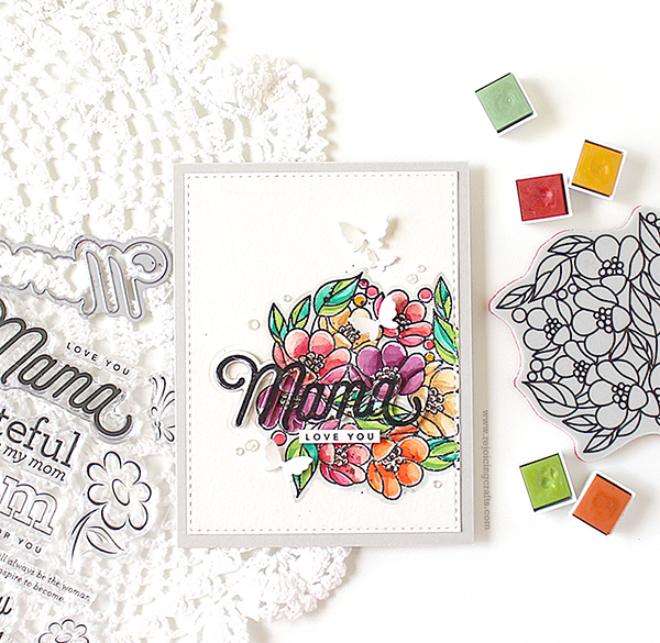 First, I die cut a rectangle panel from watercolour paper using the SSS Stitched Rectangles Panel die set. I then stamped the center floral on the bottom right corner of watercolour panel in VersaFine Onyx Black pigment ink, coloured it with watercolours and water brush. Once the watercoloured panel was completely dry, I directly stamped the sentiment “Mama” onto the main panel using the CZ Design Love You Mama set in Onyx Black, die cut it with the matching die.