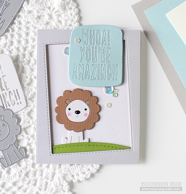 As soon as I saw the mood board, I knew I used the Simon’s Picture Book Animals. I used the Otter and the Lion dies. For the base or frame, I used the SSS Cream, Fog Gray, Sea Glass card stocks along with other colours.