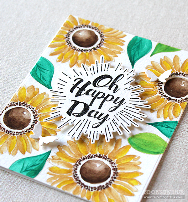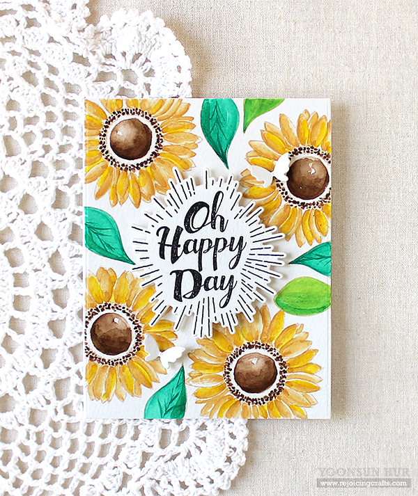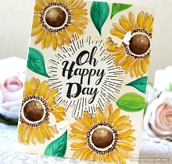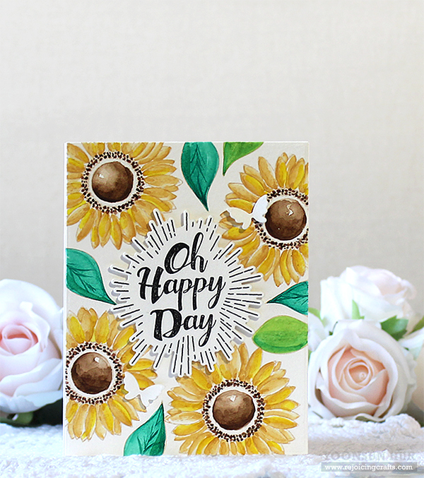 I started by die cutting an A2 sized rectangle panel from watercolour paper using the Basic Rectangles dies. I stamped sunflowers & leaves from the Summer Flowers set onto watercolour panel using Altenew Sand Dunes dye ink, and then coloured them with Hero Arts Watercolor Wheel. I stamped the “Oh Happy Day” sentiment on white card stock using VersaFine Onyx Black, and then die cut it with the matching die.