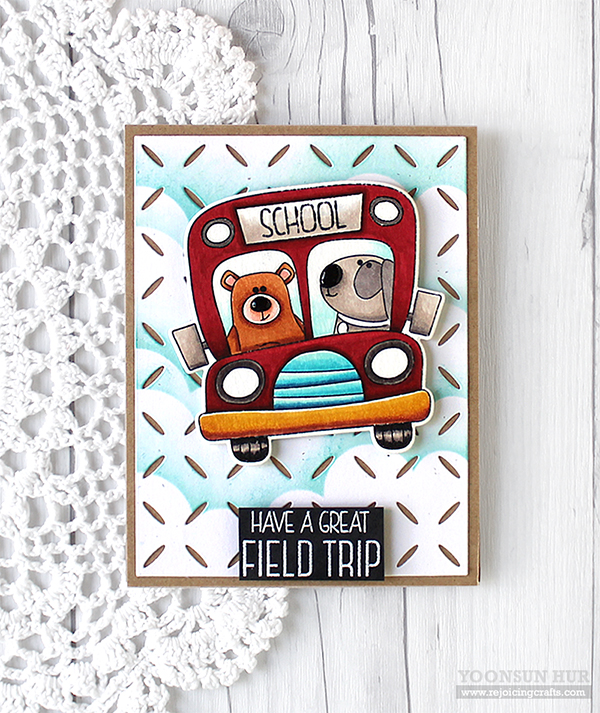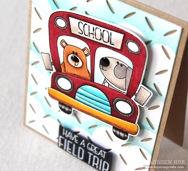 I started by stamping school bus from the School Bus Messages set on white card stock using Memento Tuxedo Black dye ink. I then stamped bear & dog from the Encouraging Animals set as well. I coloured the stamped image with Altenew Artist Markers, and then die cut it with matching die.
