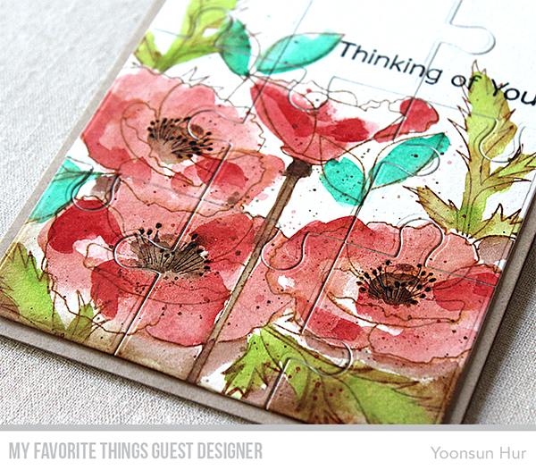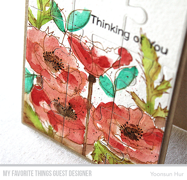 I created messy watercolour card with two of my favourites among the August release: Painted Poppies stamp set and Puzzle Cover-Up Die-namics.