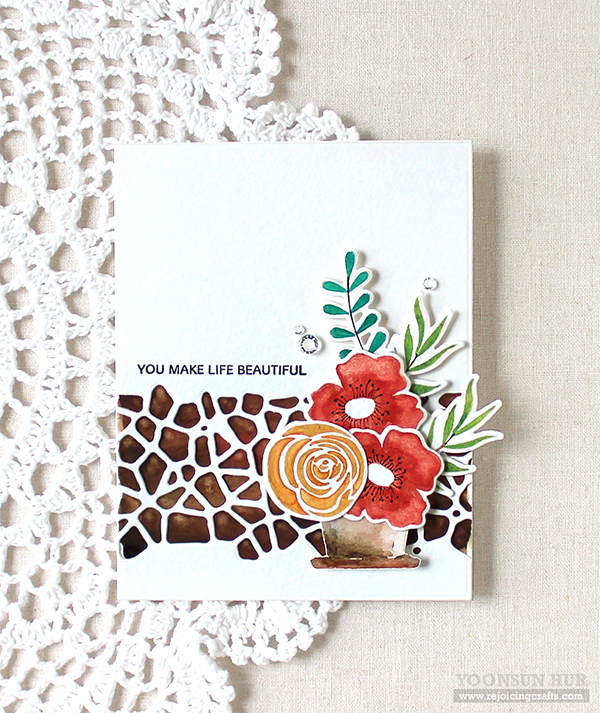 I die cut Pebbles from watercolour paper panel, adhered the earthy brown watercolour panel behind the Pebbles. I stamped the sentiment from the You Got This set right above the pebbles in black. I mounted the watercoloured pebbles panel on white card base using double-sided tape first, and then added the flower pot on the right bottom side of the card using foam tape.