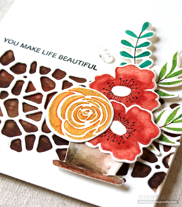 I started by stamping flowers & leaves from the Bold Flowers set onto watercolour paper using Altenew Sand Dunes dye ink – I used light coloured dye ink to stamp solid images, and then added watercolours to them. I also stamped pot from the Plantiful Puns set, coloured it with Hero Arts Watercolor Wheel, and then fussy cut it.