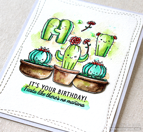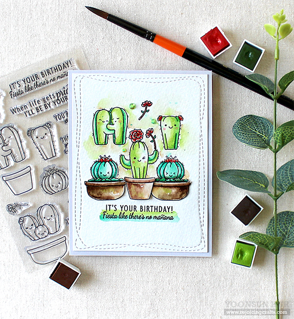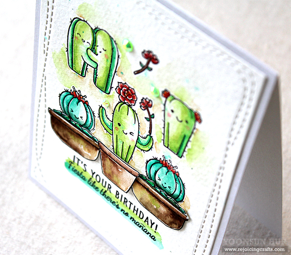 To create the card, I die cut the Wonky Rectangle panel from watercolour paper at first. I then stamped cacti from the exclusive Sugar Pea Cuddly Cacti set onto the panel with VersaFine Onyx Black, watercoloured them with Altenew Watercolor 36 Pan Set.
