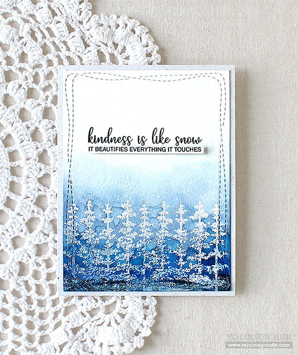 I started by die-cutting the Wonky Rectangle panel from watercolour paper, and then heat embossed snow-covered trees from the Gina K Joy of the Season set on the bottom part of watercolour panel in white. Next, I watercoloured between white embossed trees with Pinkfresh liquid watercolors: Sky blue, Sapphire, Lavender, Licorice. I left a lot of watercolour stains on purpose. I also added opaque white ink splatters here and there using Altenew Pure White Ink Spray.