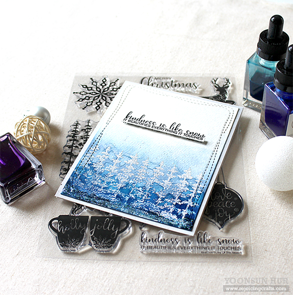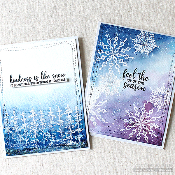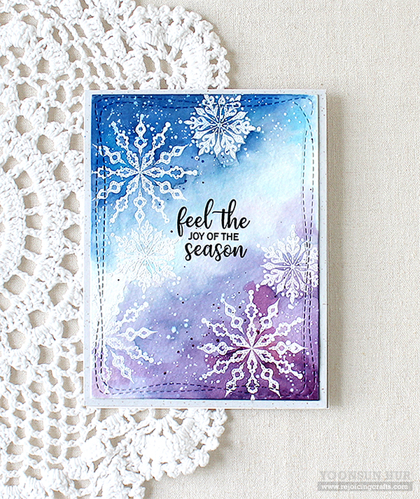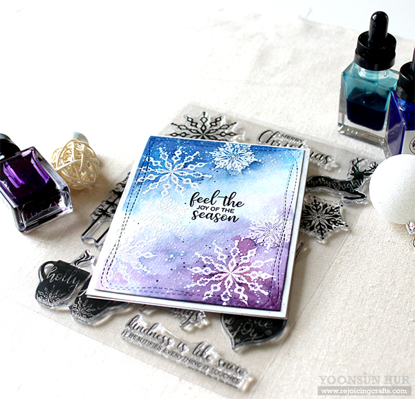 Here is one more white embossed + watercoloured Christmas card with the Gina K Joy of the Season set. I heat embossed snowflakes onto watercolour paper panel in white. I then watercoloured to the panel with Sky blue, Sapphire, and Lavender liquid watercolors, added white ink splatters as well.