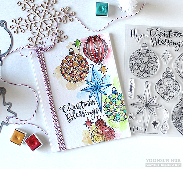 Here is another card with the Ornate Ornaments stamp set. I stamped all images using VersaFine Onyx Black first, and then watercoloured them with Altenew Watercolor 36 Pan Set.