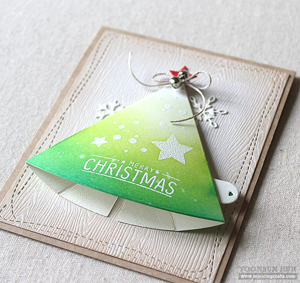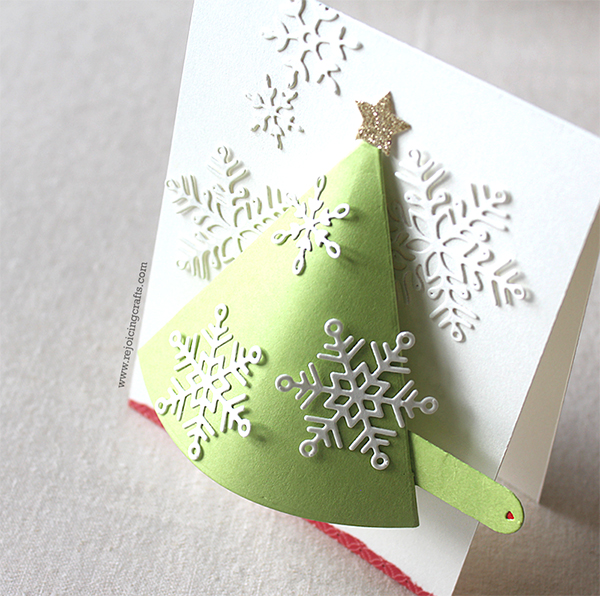I die cut Pull Tab Tree base & other elements from Green Apple card stock first, and then assembled them followed the video tutorial. I die cut snowflakes from white card stock using several Simon’s snowflake dies: Rina, Kate, Stitched Flakes.