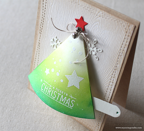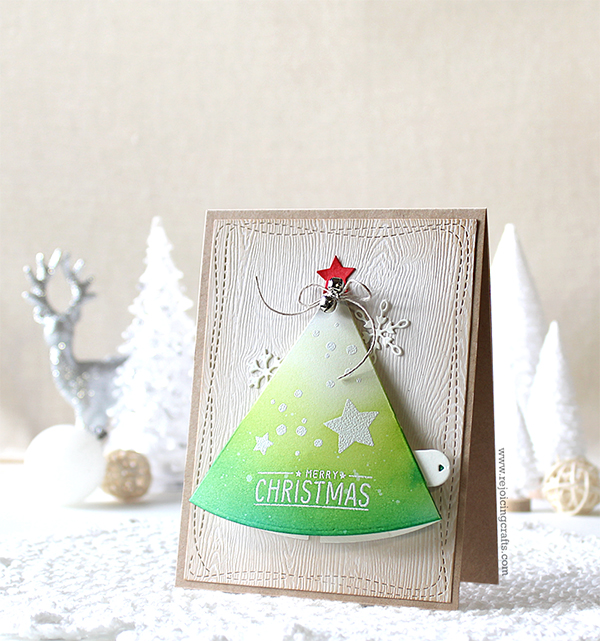 Here is another pull tab tree card! I heat embossed sentiment, snow, stars from the Christmas Tree set on the tree base with white embossing powder, and then ink blended with Twisted Citron and Evergreen Bough Distress inks. I then adhered pull-tab tree on wood patterned panel.