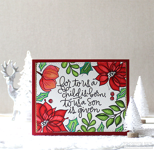 I started by die-cutting stitched rectangle panel from watercolour paper. I then stamped poinsettias & leaves from the Winter Flowers & Even More Spring Flowers sets on the edges of the watercolour panel using Memento Tuxedo Black dye ink. I also stamped the sentiment from the For To Us set on the centre of the panel using VersaFine Onyx Black.