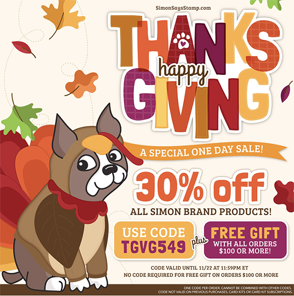 SIMON SAYS STAMP: Get 30% off all Simon Says Stamp products! The code “TGVG549“. Also, get a FREE gift with all orders over $100 (Thursday 11/22 only).