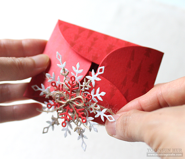 I die cut Eliza Snowflake from glitter white card stock, Kate Snowflake from kraft card stock, smallest snowflake from several coloured card stocks, and then stacked them up (as shown in the picture) using foam tape.