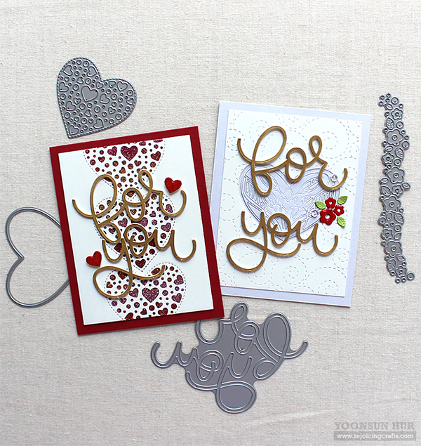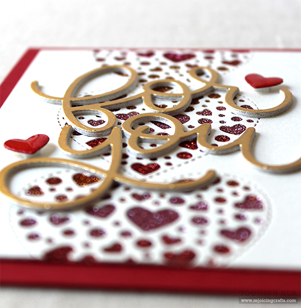 For the sentiment, I die cut the word “for you” from metallic gold card stock using the Big For You die five times, and then stacked them up using fine tip glue pen.