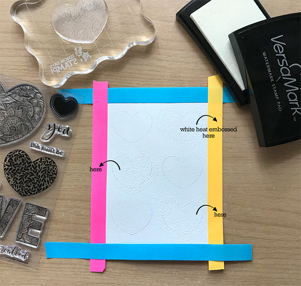 I heat embossed leafy heart image from the Ornate Love Set on the panel in white – ready to ink up with pink!