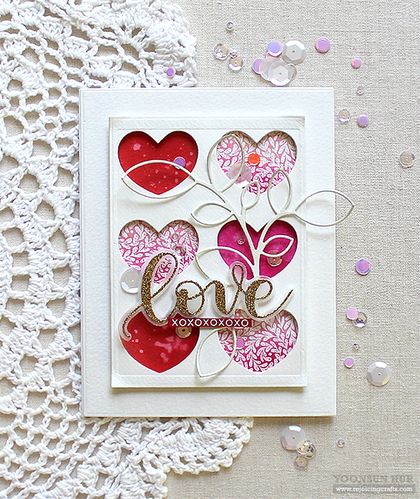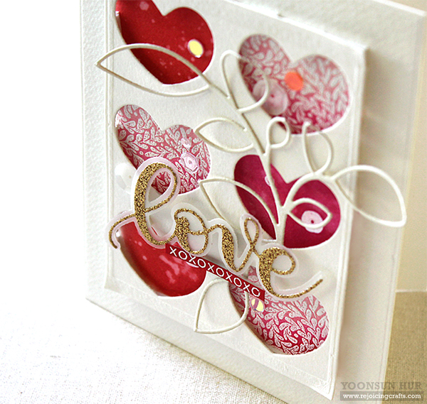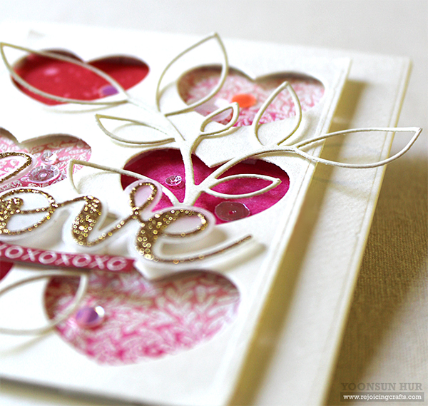 I inked up the heat embossed panel with Candied Apple, Picked Raspberry, Tattered Rose Distress Inks, then covered it with the Windows to My Heart panel using foam tape. For the sentiments, I die cut the word “Love” from glitter gold paper, shadow from vellum paper, then stuck them together using fine tip glue pen. Another small sentiment banner, I heat embossed it from the Simple Sentiments 2 Set on Schoolhouse Red card stock in white, trimmed it down.