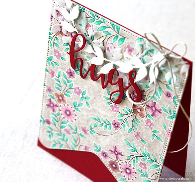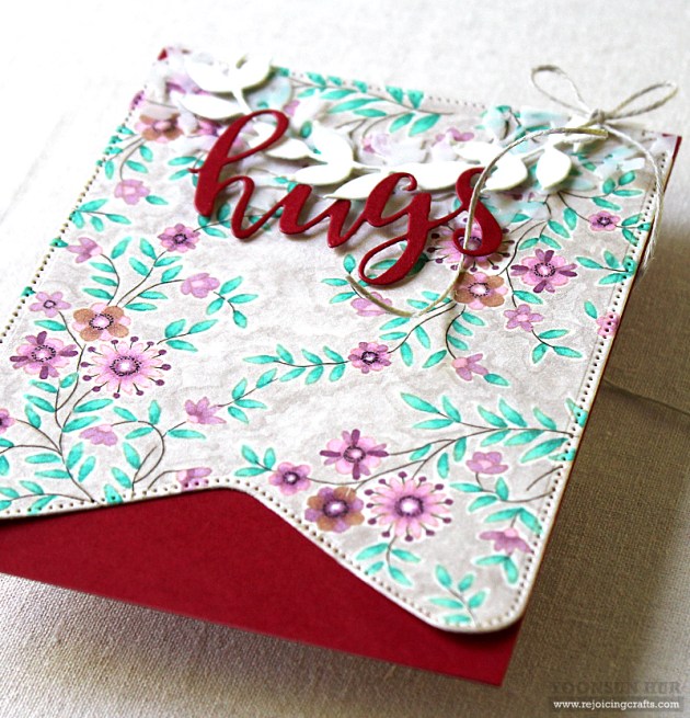 I die cut the Leafy Garland from vellum paper, the Leafy Wreath from white card stock, the word “Hugs” from Apple Red card stock, and then adhered them on the top part of the card front as shown in the picture using foam tape.