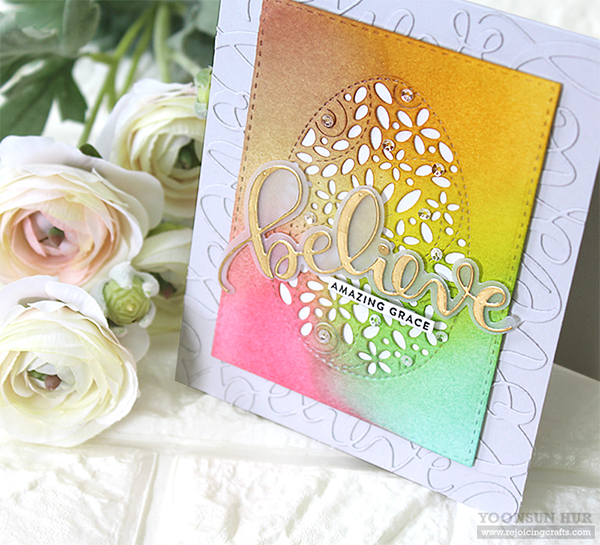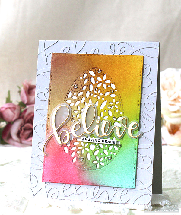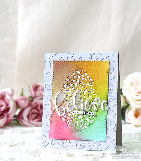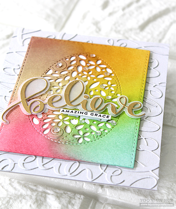 I die cut several Believe & Love words from Fog Gray card stock, adhered them onto the same coloured Fog Gray card base using fine tip glue pen. Tone-on-tone textured background is one of my favourite techniques!