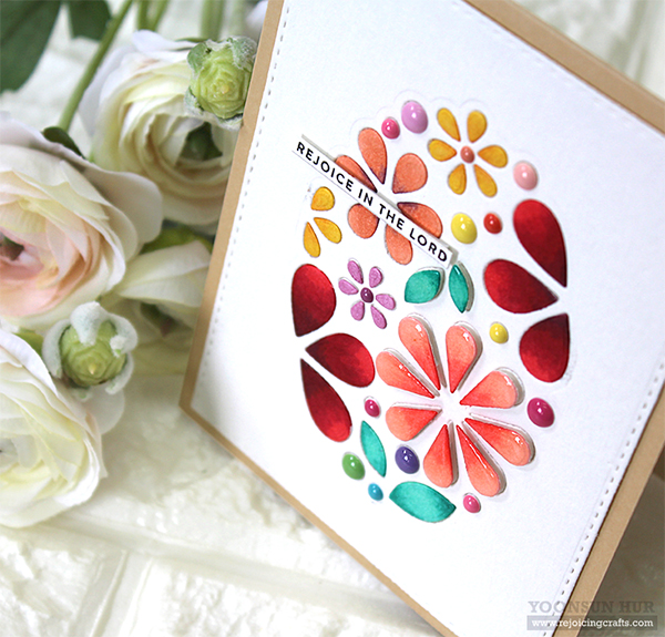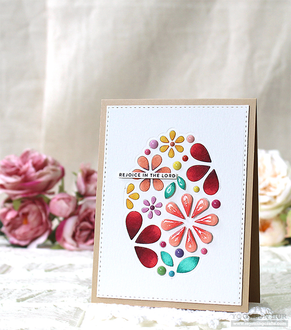 For my second Easter egg card, I used the Oval of Flowers Die. I die cut the Stitched Rectangle Panel from white card stock, and then applied the Oval of Flowers Die from the centre of the panel. Next, I coloured all die cut pieces using alcohol markers, and then adhered all pieces inside the opening with fine tip glue pen.