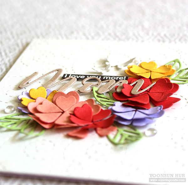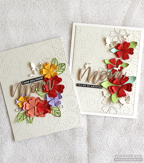 Today I have a couple of floral Mother’s Day cards with some Simon Says Stamp Dies: Script Mom, Floral Burst Collage, Outline Clustered Leaves, Partial Cut Leaves, Flickering Butterflies, etc.. I love simple floral die cards as much as I love watercolour floral cards. :D
