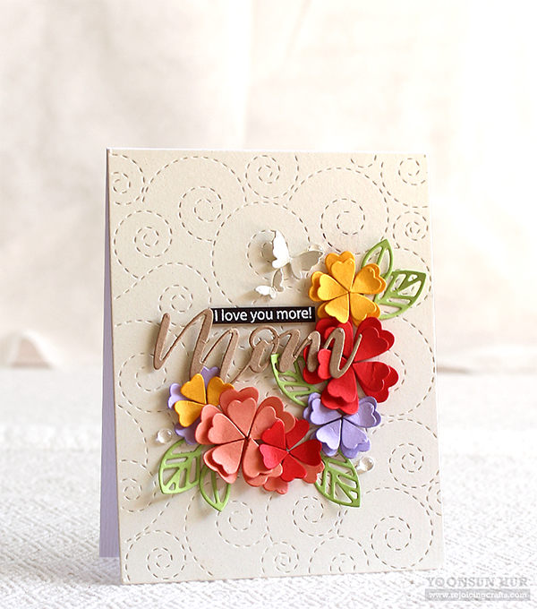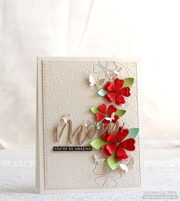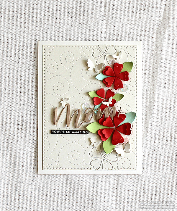 Today I have a couple of floral Mother’s Day cards with some Simon Says Stamp Dies: Script Mom, Floral Burst Collage, Outline Clustered Leaves, Partial Cut Leaves, Flickering Butterflies, etc.. I love simple floral die cards as much as I love watercolour floral cards. :D